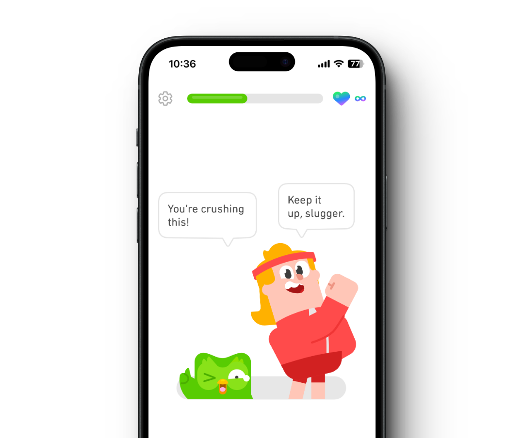 多领国在练习中途时会使用动画、文案来鼓励用户连续答对了一定数量的练习题,通过这种方式强化记忆单词这项活动的趣味性,让用户在快节奏的练习过程中得到继续答题的强反馈。