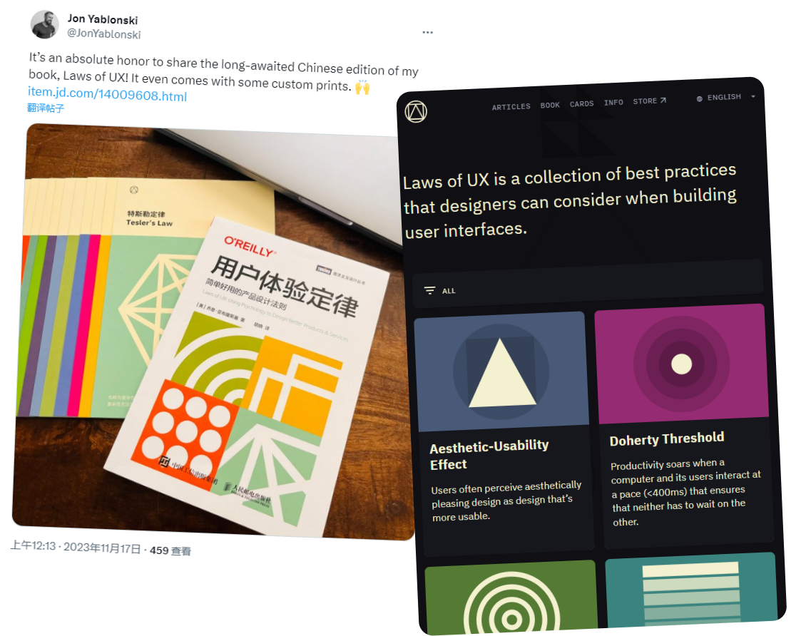 最近筹备关于用户体验的新笔记时,看到大神 Jon Yablonski 这本著名的 Law of UX 已经发行了中文版,中译本标题名为《用户体验定律》,发行时间恰好是前几天的11月17日。